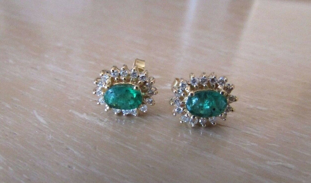 14K Pretty Yellow Gold Oval Emerald Stone Earrings With Round Diamonds 1.85 Cts