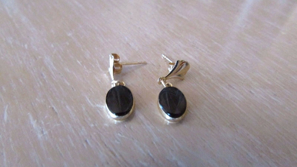14K Pretty Yellow Gold Oval Onyx Drop/Dangling Earrings 0.9 Grams