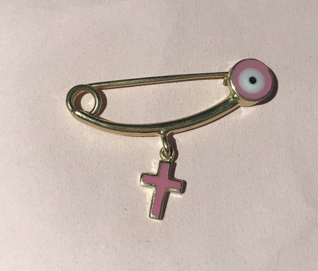 14K Pretty Yellow Gold Pink Evil Eye Safety Pin With Hanging Pink Cross