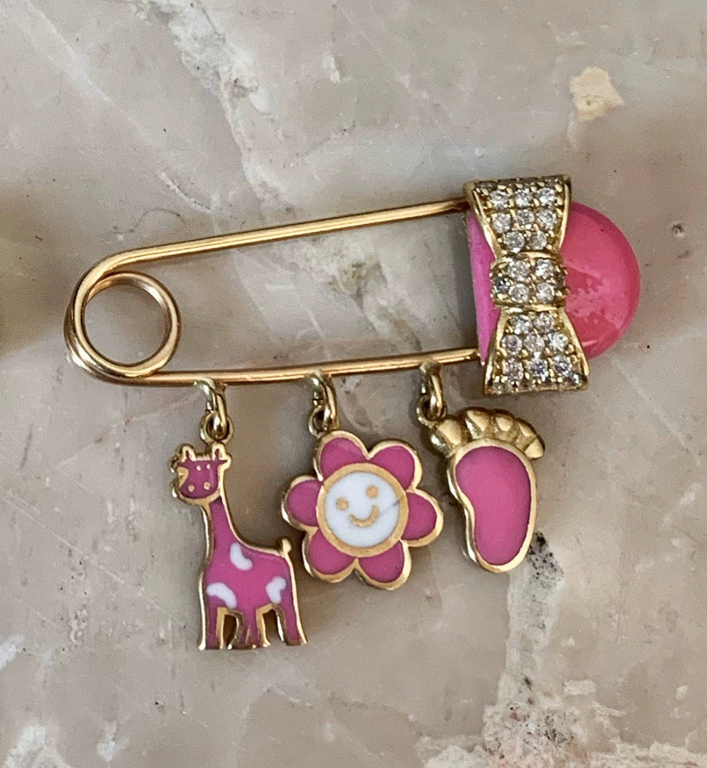 14K Pretty Yellow Gold Pink Safety Pin With Bow, Flower And Giraffe